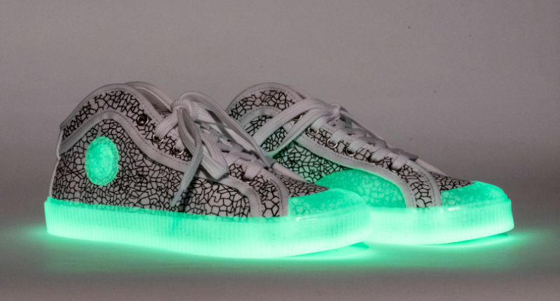 Uma sapatilha com fundo branco e um padrão de linhas retas negras - reminiscente da arte da calçada portuguesa, um dos traços mais típicos da cultura portuguesa - e que brilha no escuro, é fruto da criatividade de uma equipa de cinco alunos do IADE, vencedores do desafio criativo que a SANJO lançou aos estudantes das licenciaturas de Design, Marketing e Publicidade, Fotografia e Cultura Visual e Ciências da Comunicação, no início do ano.