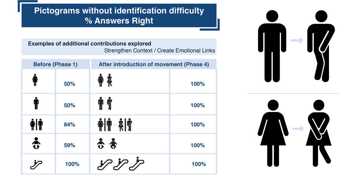 A investigação analisou proposições especulativas para adicionar movimento a 13 pictogramas do sistema AIGA (um dos sistemas pictográficos mais utilizados no mundo, desenvolvido pela associação internacional AIGA). Após a modificação dos pictogramas, foram recolhidos dados, por meio de entrevistas e grupos de foco, a dois grupos distintos de designers e não-designers, que ajudaram a concluir que a introdução do movimento pode ser uma contribuição importante para facilitar a interpretação de pictogramas e permitir que eles se desenvolvam com características diferentes, por exemplo, para incentivar o comportamento cívico, aprimorar o conteúdo de uma mensagem e criar laços emocionais.