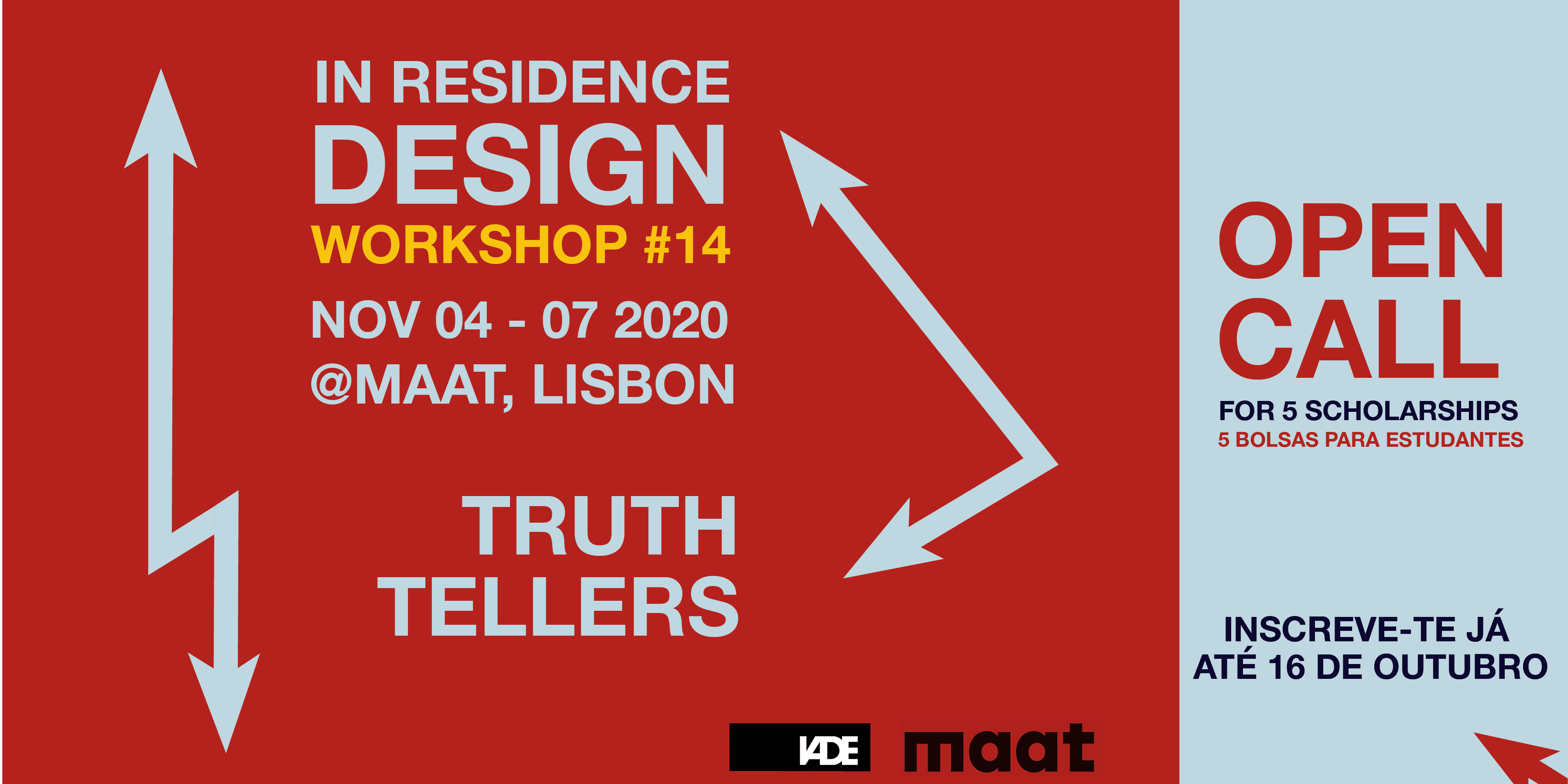 O IADE associou-se ao MAAT para atribuir 5 bolsas para a frequência do workshop "Truth Tellers", o programa IN RESIDENCE Design Workshop #14, desenhado pela dupla IN Residence (Barbara Brandi e Marco Rainò) e que conta com os convidados Thomas Ballouhey e Soft Baroque.