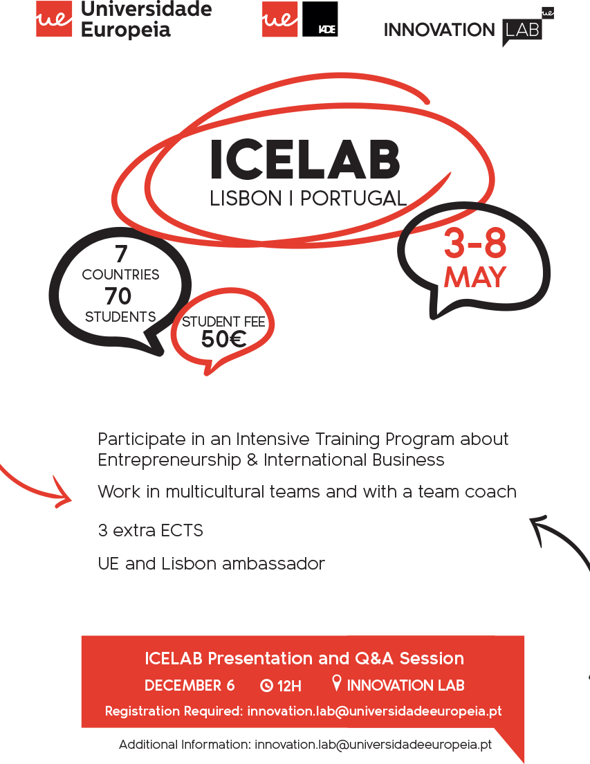 Ler maisO ICELAB é um desafio de educação dedicado ao empreendedorismo, inovação empresarial e internacionalização de negócios, decorrendo em ambiente de start up e que, em Portugal, conta apenas com a participação da Universidade Europeia. Em paralelo, o programa internacional pretende promover a interação cultural e o networking entre a população universitária de vários países diferentes.